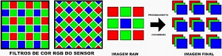 Quando uma imagem é exposta no sensor de imagem (CCD/CMOS) numa câmera digital, cada pixel gera uma certa voltagem de acordo com a intensidade da luz incidida. Esta voltagem de cada pixel é digitalizada normalmente em 12 bits ou 14 bits. Em 12 bits pode representar até 4.096 níveis diferentes de luminosidade e em 14 bits, até 16.384. Esta imagem digital que representa exatamente como é no sensor, por isso ainda mosaica, é a imagem RAW, que traduzindo seria crua ou bruta (sem processamento). Após a digitalização, é realizada uma compressão normalmente sem perda (lossless) ou com uma ligeira perda, mas nada que seja perceptível. Pode ser armazenada em formato RAW onde contém todos os ajustes da câmera, chamado de negativo digital, equivalente a negativo de um filme fotográfico. A câmera também processa e converte para formatos TIFF ou JPEG, prontos para impressão ou visualização na tela. Se desejar ampliar a ilustração abaixo, clique em cima.